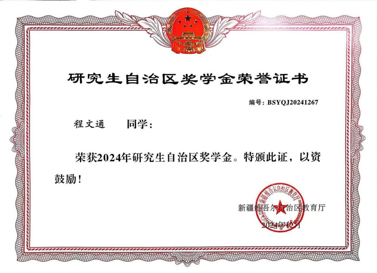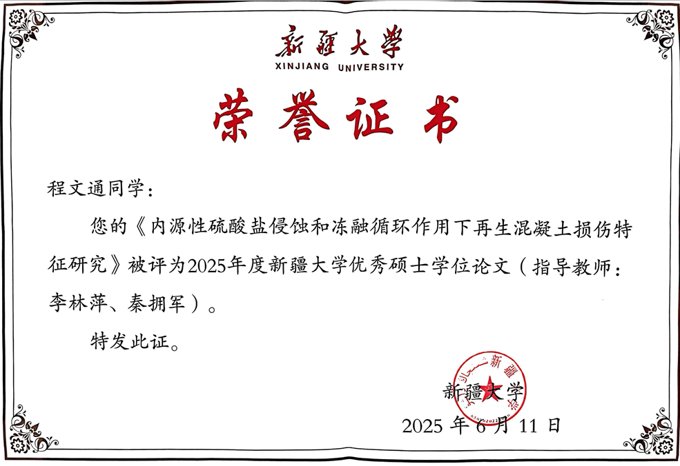 攀登高峰:在科研中追求卓越 本科毕业并非终点,而是新程的起点。程文通凭借优异成绩考入新疆大学,攻读土木工程专业硕士学位。在更宽广的学术舞台上,他延续勤勉钻研的作风,于2024年荣获新疆维吾尔自治区研究生奖学金,并发表核心论文一篇、获得专利一项,逐步完成了从知识汲取者到科研实践者的跨越。