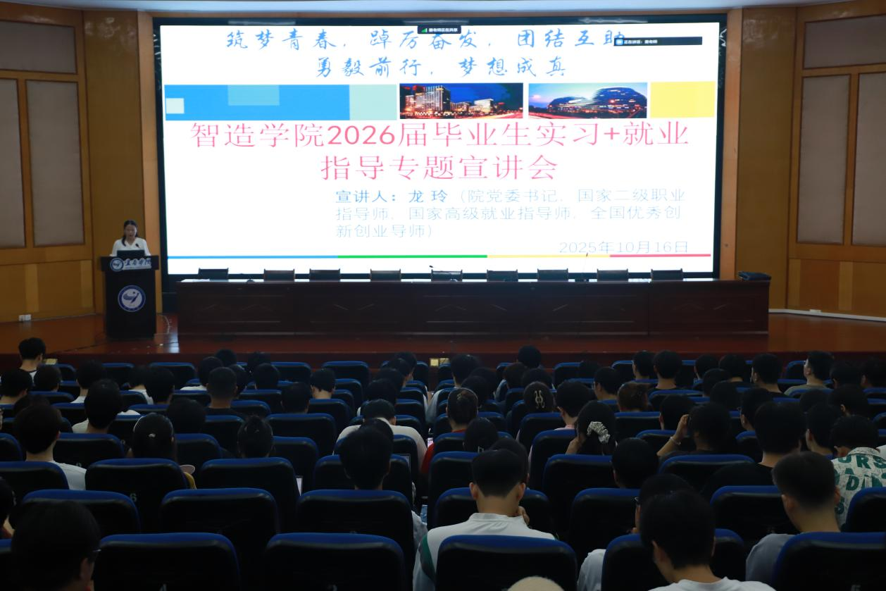 (本站讯 学生记者 高禹彦 赖泽锟 朱子轩)为扎实推进2026届毕业生“实习+就业”指导工作,切实提升毕业生就业竞争力,10月16日晚上七点,智造学院在主教楼三楼学术报告厅召开2026届毕业生“实习+就业”指导专题宣讲会。会议由院党委书记龙玲主讲,院党委副书记袁平、学生工作办公室副主任陈浩、就业干事姜思琪老师、毕业班全体辅导员(班主任)及全体在校毕业生参加,在外顶岗实习师范生和联合培养的57名毕业生通过线上会议参会,线上线下同步500余名师生共同参会,整体宣讲氛围非常好。